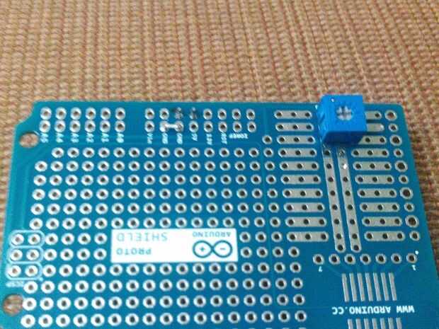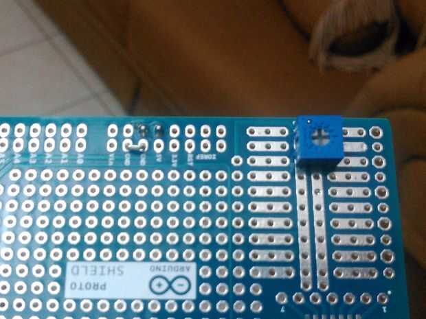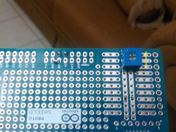 En este paso, vas a conectar los dos GND cerca a + 5V para que tengas todo conectado de la tierra y así que usted puede instalar el pote de 10K en la pista de tierra y entonces usted puede conectar a + 5V seguir así y terminar las conexiones de este componente para soldar el perno central a otra pista cercana.