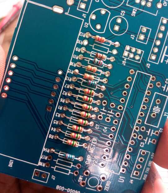 Vamos a empezar a soldar. Es fácil empezar con resistencias. Es necesario identificar el lugar de resistencias de la lista de piezas. Asegúrese de que cada resistencia es de lugar en lugar apropiado. Se puede utilizar un multímetro para confirmar. Poner todas las resistencias en la placa y luego adhiera un pedazo de grifo aislado para que las resistencias no pueden desplazar a la hora de soldar. Luego cuidadosamente la resistencia de la soldadura y retire el grifo.