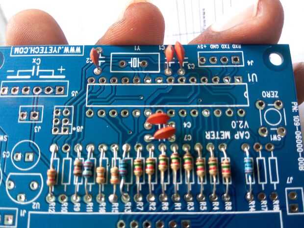 Después de soldar las resistencias son fácil de soldar todos los capacitores de PCB. Usando la lista de piezas puesto todos los capacitores de disco en el lugar adecuado y la soldadura. Luego poner dos condensadores electrolíticos en el lugar. Pero tenga en cuenta, el condensador electrolítico tiene polaridad y el Cojín cuadrado en el PCB es de polaridad positiva. Así que largo retraso del condensador Cojín cuadrado.