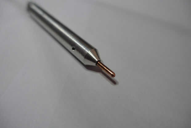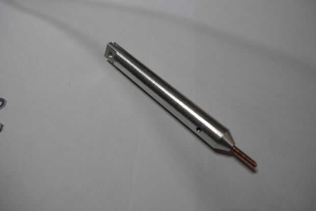 Hice mis electrodos de barra de aluminio, el diámetro es de unos 10mm. En otros diseños que he visto los electrodos sólo redondeados un punto embotado. Esto parece absolutamente bien, pero decidí hacer las puntas reemplazables en caso de quiero experimentar con perfiles diferentes de punta. Para ello me había aburrido un agujero de 3mm en el extremo del electrodo luego usa un tramo corto de la varilla de cobre de 3mm como un Consejo. La punta está sujeta con un tornillo de 3mm sin cabeza
