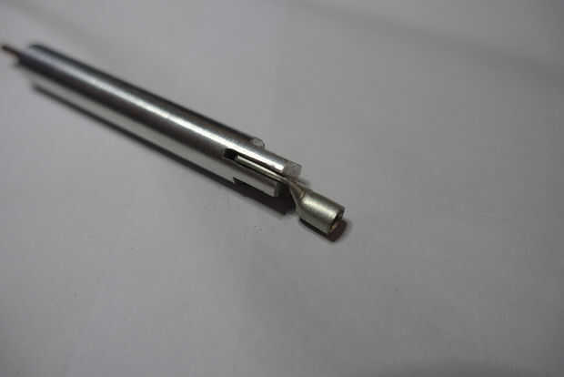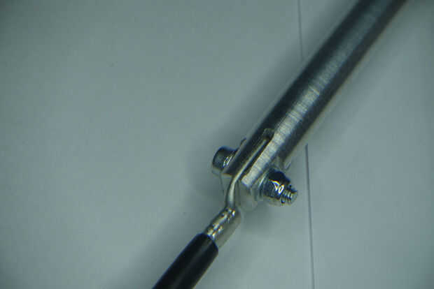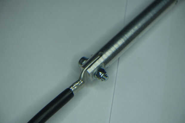 En el otro extremo del electrodo hay una ranura para alojar el terminal de presión en el final de los 8 calibre de cable. Un asimiento de pernos y tuercas de 4mm en lugar - recuerda usar grasa conductora en esta articulación el conjunto es cubierto en la tubería del encogimiento del calor.