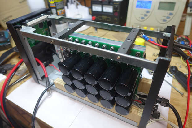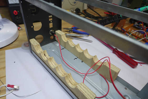 Utilizando materiales que ya tenía en el garaje montado en la Asamblea de PCB dentro de la caja. Yo descansaba la parte inferior de los condensadores en una madera antigua. Esto fácilmente se hizo de un pequeño trozo de madera contrachapada. Yo 32mm agujeros perforados y luego dividir la pieza por la mitad. Me fijo entonces las barras en posición con 2 barras de plástico (otra vez los de un proyecto anterior), sujeta con tornillos y bots de m4.