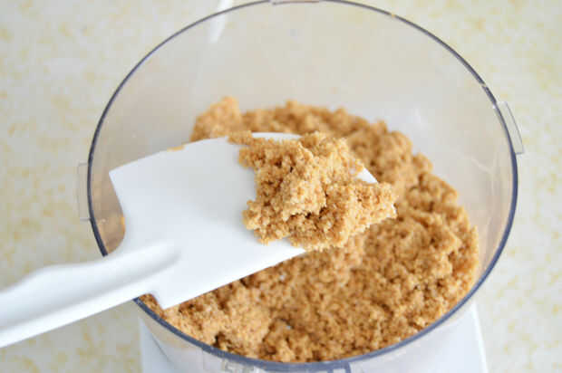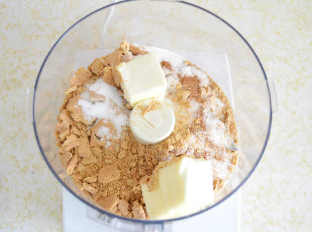 Romper las galletas en pequeños pedazos y ponlo en el procesador de alimentos. Junto con la mantequilla (temperatura ambiente), azúcar, sal y canela. Mezcla hasta que todos los crackers rompen y combinan muy bien con los demás ingredientes. La textura debe ser como se muestra.