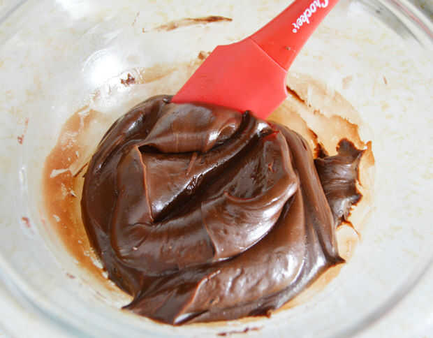Tomar semi dulces chocolates y 1/2 lata de leche condensada y microondas de 2 a 2.30 minutos hasta toda la derrite chocolate. (Este momento difiere de un microondas en microondas) Así que recomiendo hacerlo en intervalos de 30 segundos. No debe tomar más de 2,30 minutos. Haciendo más tiempo hace que el chocolate aceitosos. Por lo tanto, tenga cuidado de no hacer demasiado. Añadir 1/2 cucharadita de extracto de vainilla y una pizca de sal y mezclar bien. La consistencia será como chocolate dejará el recipiente suavemente cuando Date un paseo por con la espátula y no será pegajoso. (Como se muestra en la imagen)
