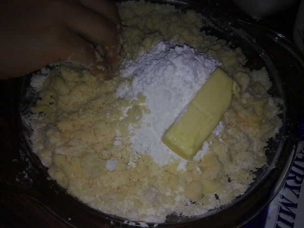 Hacer pequeñas piezas de 125g de mantequilla. Tomar la harina en un plato y mezcle la mantequilla lentamente con la punta de los dedos. Por seguir añadiendo la mantequilla hasta que mezcla se asemeja a pan rallado fino (unos 100 g). Luego agregar 4 cucharas de mesa de la mantequilla 25 g de azúcar impalpable y el escariado a él y mezclar para formar una masa dura.