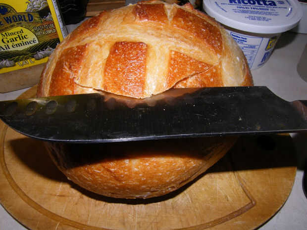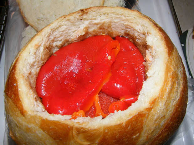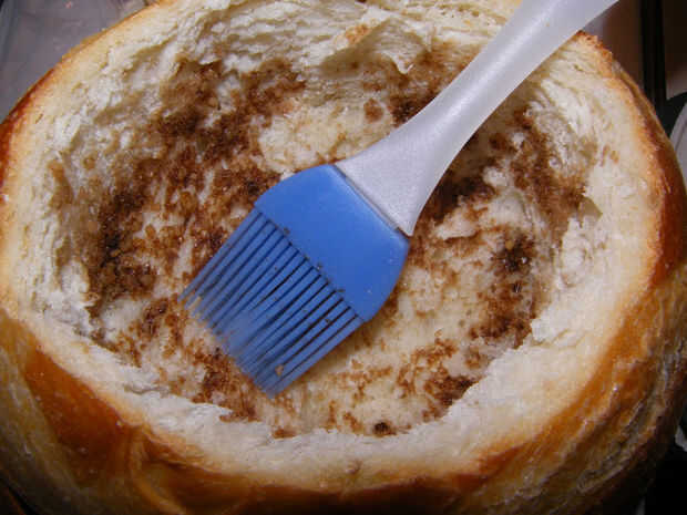 Corte la parte superior de la pan (como se muestra en la imagen y ponga a un lado) y hacer un hueco el centro cortando el interior del pan, pero dejar un borde de alrededor para que la cáscara no es demasiado fina.