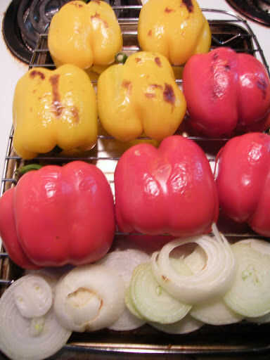 Mitad de cada pimiento, semillas, lava limpia y pat seco, espolvorear con sal. Rodaja redonda de la cebolla y el lugar todo sobre una rejilla. La parrilla durante 10 minutos, vuelta y parrilla por 10 minutos.