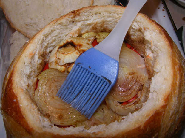 Mezcla de vinagre y ajo picado (y otros ingredientes si usted los USA) y cepille generosamente la cavidad de la hogaza.