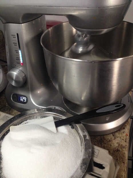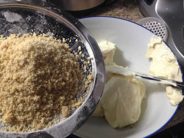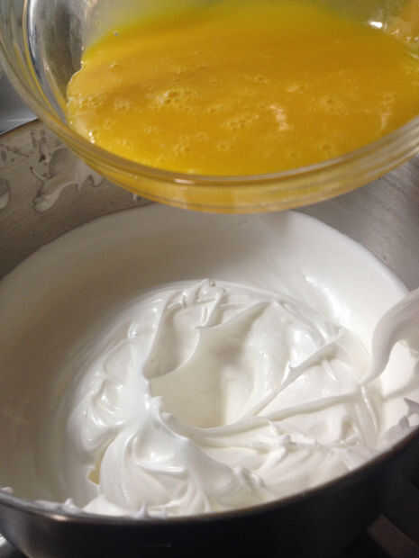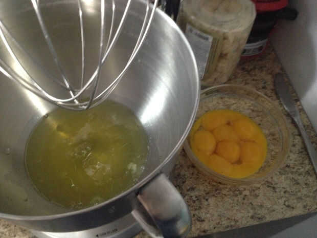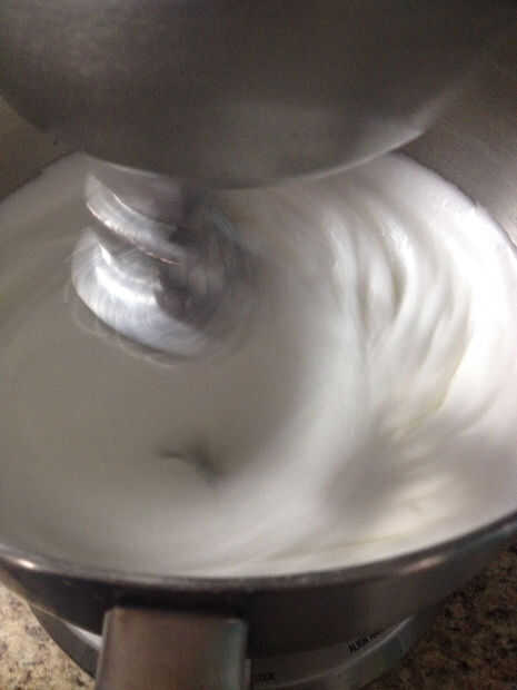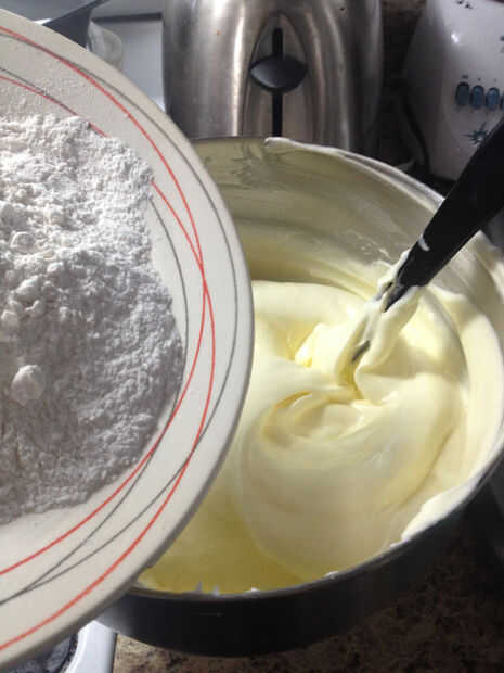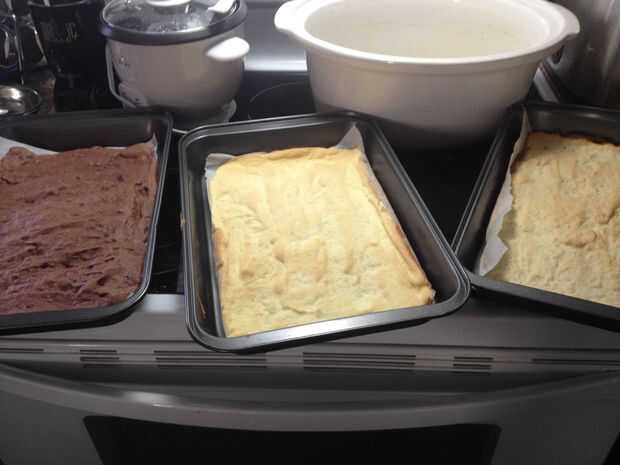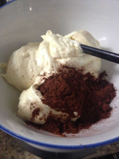 Bata las claras de huevo en un tazón, lentamente agregar azúcar, batir hasta que esté espesa. Agregar las yemas luego harina. Divida en 3 porciones. En el primer recipiente, añadir las nueces del suelo 1/2C. En el segundo, agregar cacao en polvo y en el último recipiente, dejarlo como está. Hornee a 350 F durante 12-15 minutos. Deja enfriar antes de proceder.