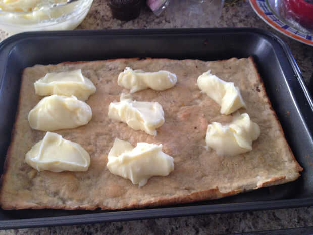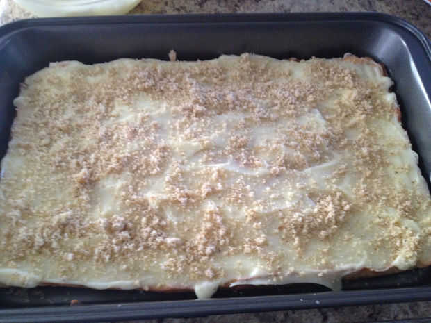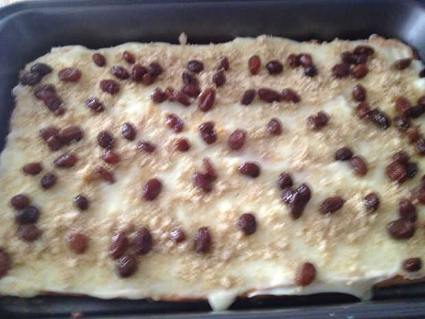 En una bandeja para hornear tan grande como el pastel, coloque el pastel de nuez como la capa inferior. Espolvorear con 1/3 del jarabe, extensión con 1/3 de las nueces y las pasas de uva y top 1/3 de la crema de vainilla sobre las nueces.