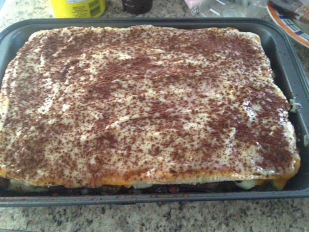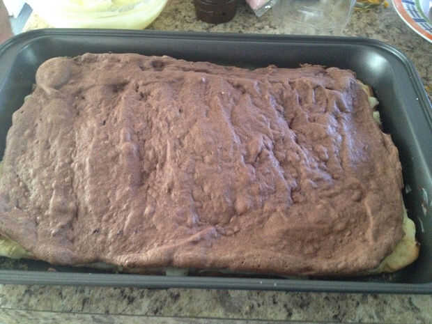 luego cubra con la capa de chocolate y repetir el paso como arriba (almíbar, nuez, pasas de uva, crema).
