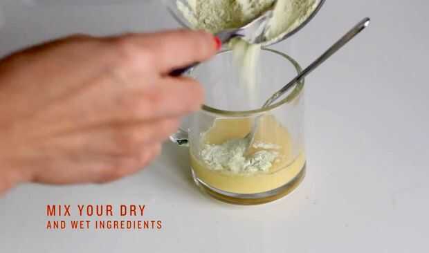 Añadir los ingredientes secos a los ingredientes húmedos ya en el recipiente, teniendo cuidado de no mezclar demasiado.