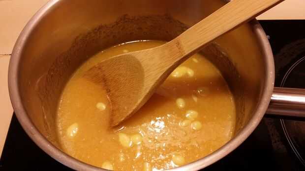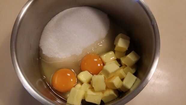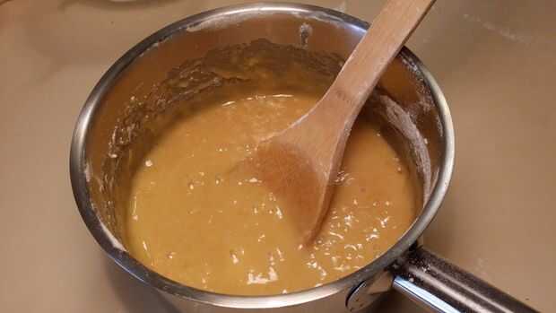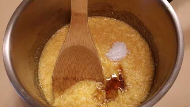 Mezclar los huevos, el azúcar y la mantequilla en una olla pequeña. Agregar soda y miel. Calentar la mezcla (revolviendo constantemente) a fuego lento hasta que la mantequilla se derrita. Retire la cacerola del fuego, añadir 2 tazas de harina y mezclar bien.
