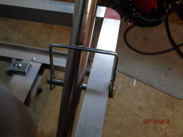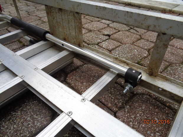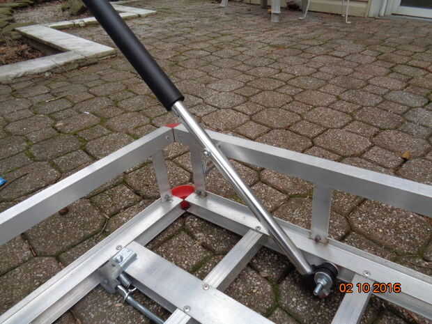 Perforé un par de agujeros en el mango y al lado de la caja de modo que pude conectar el soporte superior ya sea con un perno, o más bien, opté por usar un alfiler con una cerradura del broche de presión, por lo que se encuentra fácilmente para arriba y fácilmente removido para que el mango se puede plegar. Cuando no esté en uso, guardar las cerraduras de cierre en los orificios de la caja.