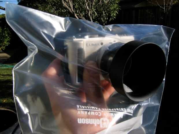 No hay ningún parasol para la Lumix, y no utiliza un poncho de la lluvia. Quería un pequeño kit de llevar conmigo en el caso. Unos pocos dólares en la tienda de hardware y una Ziploc y mi cámara está lista para la tormenta. Como un bono, terminé con un parasol bastante elegante para la cámara, para cuando el sol está hacia fuera.