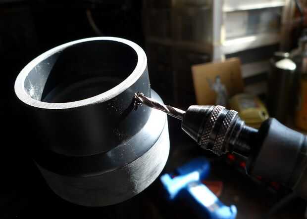 Si no tienes acceso a un taladro, puede encontrar otra manera de hacer un agujero en el PVC relativamente suave: un punzón (como usted encontraría en una navaja suiza) trabajo, o un soldador fundir un agujero aseado a través (y apesta su taller para arriba).