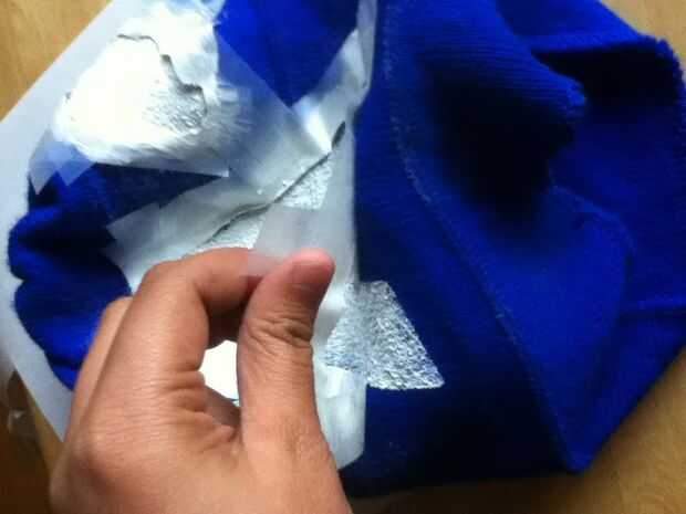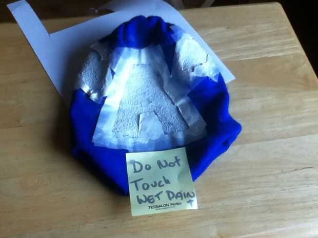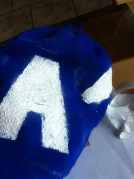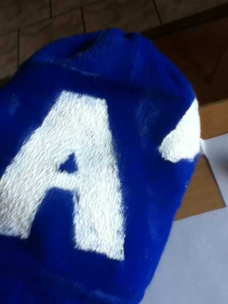 Esperar a que la pintura se seque (incluso puse una señal de pintura húmeda no táctil) y luego retire la plantilla de la cinta. Mundo tiene un sombrero de Capitán América bastante bueno si lo digo yo!