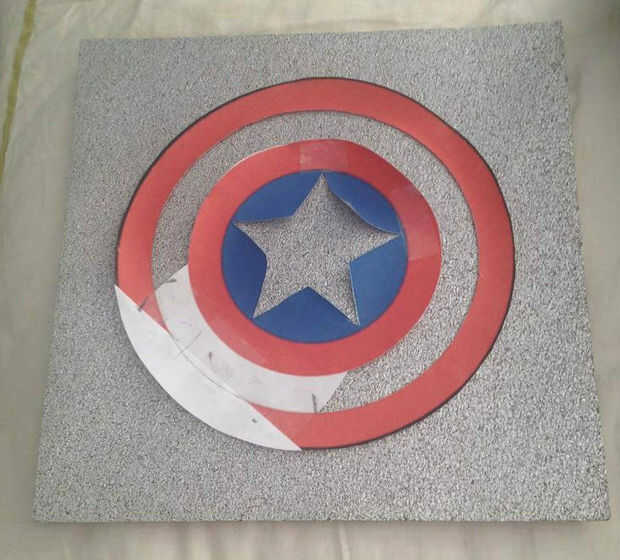 Usando tijeras o un cuchillo, cortar el escudo. A continuación, para evitar que trozos de papel pegados a las uñas, cortar la estrella y la mayoría de la parte blanca. Quiere dejar ese pedazo pequeño de blanco, por lo que todos los círculos son equidistantes. Ahora, puede tratar de este centro en su corcho y empezar a poner las uñas.