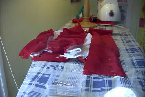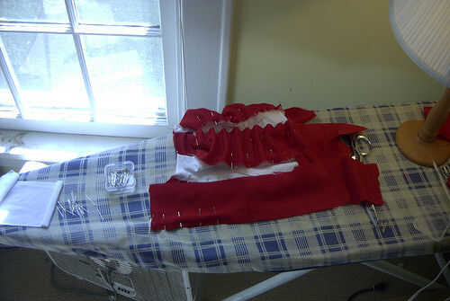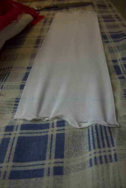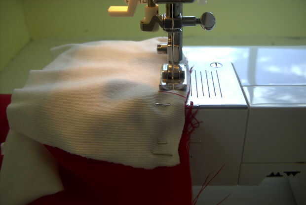 * Esto es donde me gustaría asegurarse de que usted es consciente de las dificultades de tratar de coser juntos dos telas de elasticidad muy diferente. No lo hacen! Básicamente sólo terminé estirando el blanco como iba y tenía que definir ambos extremos extendidos para el rojo que el perno. Funcionó y estuvimos bastante contentos con los resultados, pero no lo recomiendo. Estoy incluyendo mis fotos, sin embargo, para ayudar a cualquier persona que, como yo, no podría encontrar conveniente fabric.* rojo
