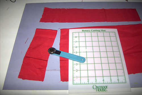 En primer lugar, medir su tema y camisa. Divida ese número por 12 (pensamos tapa debe tener 13 franjas como la bandera... pero que dos franjas del mismo color terminan al lado de uno, y eso definitivamente no funciona). Terminé mis tiras de corte a unos 3". I cortar el rojo primero, luego corte la parte inferior de la camisa y cortar las tiras blancas.