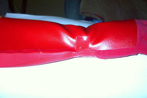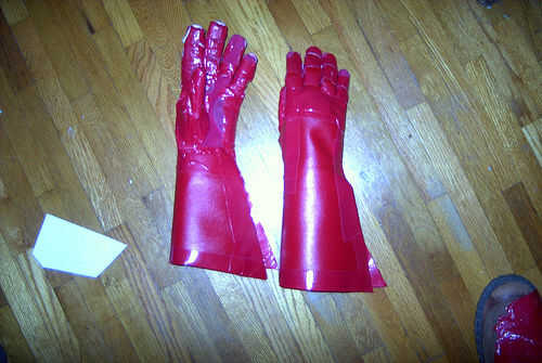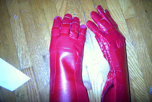 En primer lugar, cortar vinilo para servir como guantes. Use cinta adhesiva rojo para unir a los guantes. Cinta alrededor de los bordes para la estabilidad. Tenga cuidado de dejar una abertura lo suficientemente grande como para permitir conseguir los guantes de encendido y apagado. Tapa también envolver cinta alrededor de los dedos para un look rojo brillante aún más.