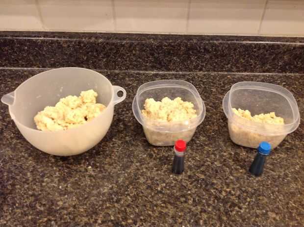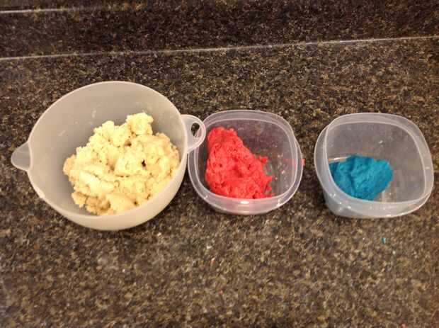 Mezcle todos los ingredientes juntos excepto el colorante. Después de mezclar, dividir la masa en tres tazones de fuente separados para los tres colores utilizados. Tendrás el color puro para tener la mayoría pasta, luego el rojo, y por último azul. Usted no necesita mucho masa azul, pero asegúrese de hacer suficiente! En las imágenes puedes ver cómo dividido la masa. Al final, tenía porciones de extra azul.