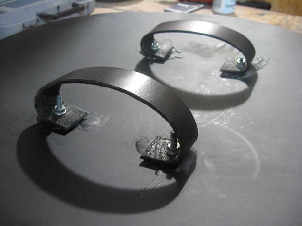 Un cinturón viejo fue utilizado para hacer las asas de la parte posterior del escudo. Los agujeros fueron perforados a través de los extremos de dos piezas de la correa, y éstos fueron atados a los pernos que se ajustaron a la parte posterior del escudo.