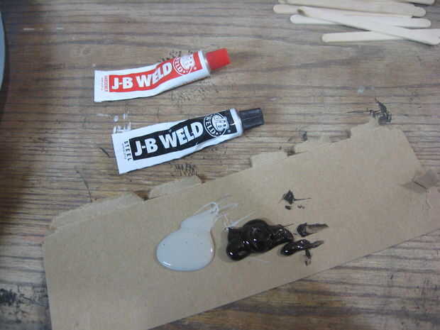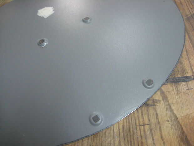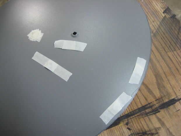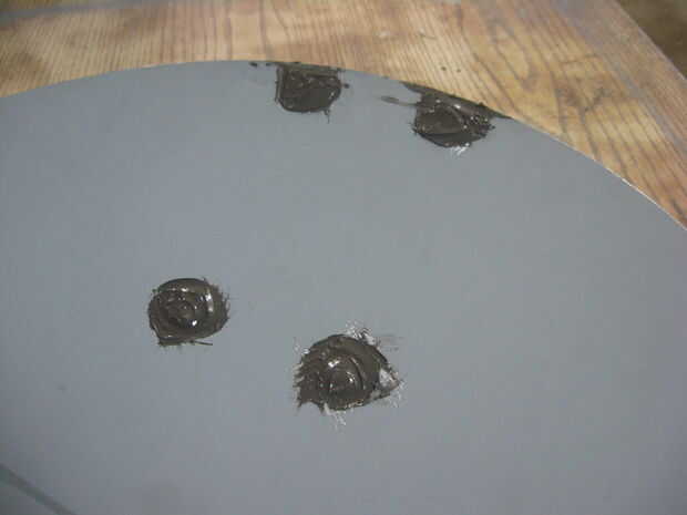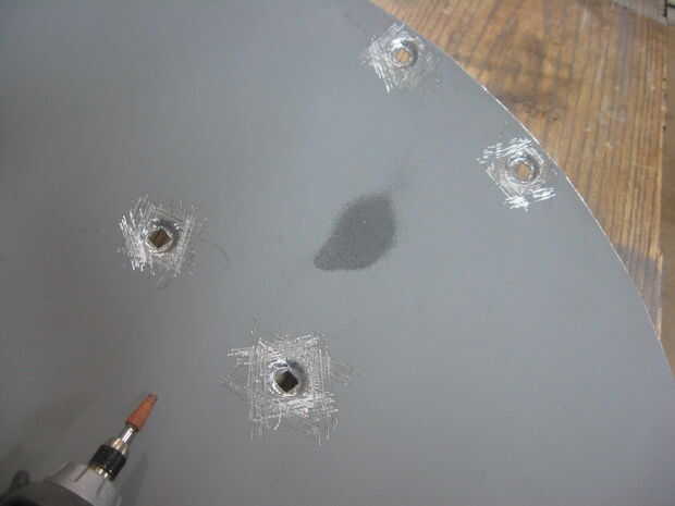 Usé una Dremel pulido poco para retirar el acabado del plato y hacer áspera el área alrededor de los agujeros de perno. Entonces usé JB Weld para llenar los lugares donde habían estado los pernos. Cinta adhesiva fue utilizada para cubrir la parte posterior de los orificios mientras el JB Weld curado.