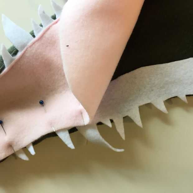 Cortar la parte superior de la tela verde oscurezca y lo mismo para la parte inferior de la mandíbula. Opté por Vieira los bordes de la mandíbula, tratando de hacer similar a un cocodrilo real. No gire hacia fuera exactamente correcto pero parecía bastante grande.