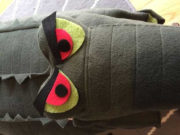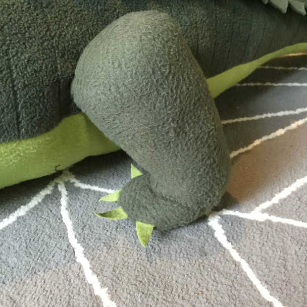Para las piernas hice un tubo con una zona de muslo superior redonda y una ovalada de fondo plano con garras de triángulo. Deben ser muy rígidos para que pueden valerse por sus propios y ser arrastrados alrededor. Coloque el extremo abierto del tubo a la zona de pata oval. Mano coser estas en el lugar donde usted quiere las patas traseras.