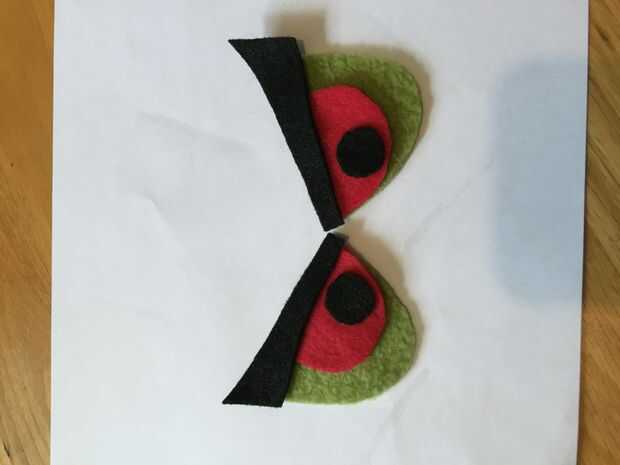 Quería que los ojos parecen un poco maniática así que añadido algunos cejas rojas y media. I corte de fieltro y les pegan y luego había pegado a la zona de cabeza de globo ocular.