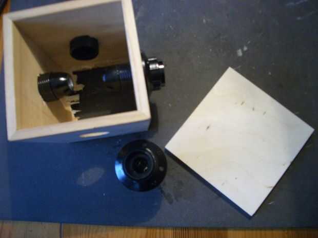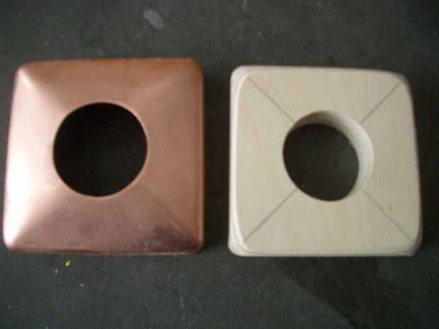 Que corté un agujero a la tapa de cobre y dos piezas de madera contrachapada para la parte superior de la lámpara.