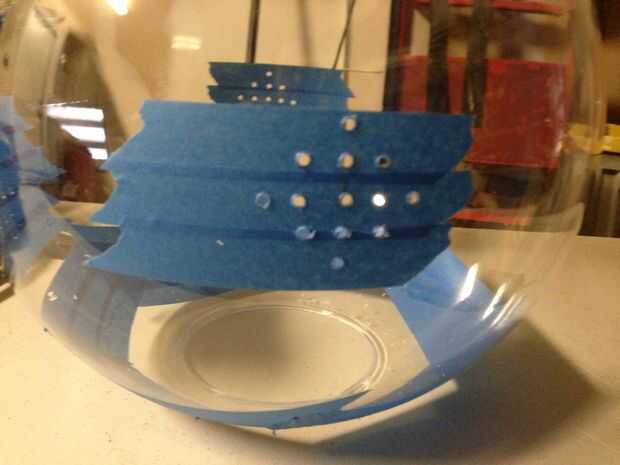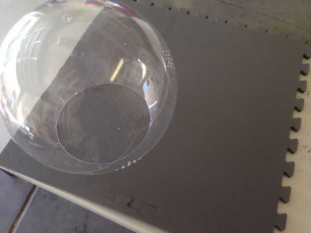 Para el casco ordenó a un diámetro de 14" claro de globo acrílico.  El tipo de las utilizadas para los accesorios ligeros.  El cuello del globo fue sólo 6" que es demasiado pequeño para la cabeza de mi hijo caber a través así que tuve que cortar la abertura un poco más grande.  También necesitaba perforar algunos agujeros para escuchar a través de y para permitir que aire fresco para que no sofoca.  El acrílico no es que gruesa así que había preparado con alguna cinta de enmascarar como un seguro adicional contra fractura.  Me aseguré de perforaciones muy lentamente y no utilizar demasiada presión.  Cuando corté el labio existente en el mundo de apertura había reducido seriamente la integridad de todo el asunto.  Era necesario reforzar el orificio de cuello como hacer para que no sea un filo contra el cuello y los hombros de mi hijo.  Usé una estera de piso de cochera de espuma para hacer un anillo del mismo tamaño que la abertura y había pegado en lugar.