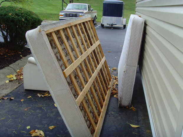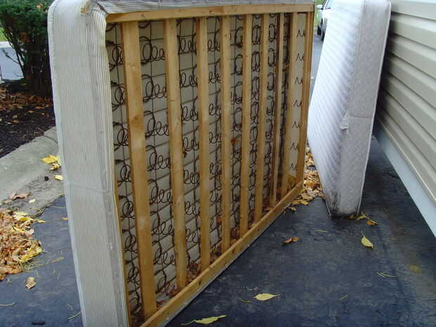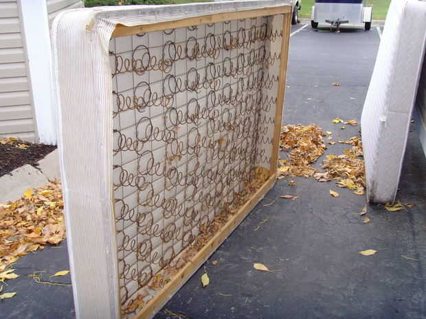 Paso 2 - la parte difícil. Los resortes están grapados a las vigas verticales (ver fotos 2 y 3). He encontrado que es la mejor manera de quitar las grapas con un destornillador de cabeza plana estrecho. Tarda algunos curiosos, pero usted debe poder conseguir todos hacia fuera. Los extremos de estas vigas son también grapas al marco exterior, pero pueden golpear flojos con un martillo.