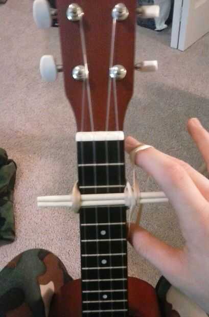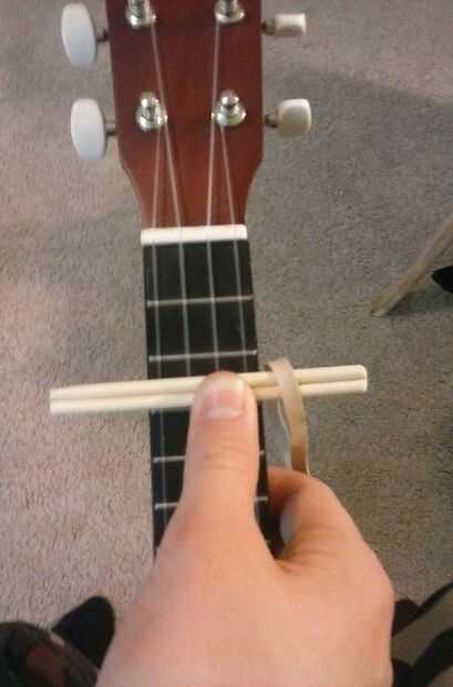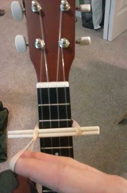 Para poner el capo, la manera más fácil es primero ponerlo en cualquier traste desee en el puesto la goma en un lado del palo llevarlo alrededor de la parte posterior del cuello al otro lado, retorcerlo y luego alrededor de la parte posterior del cuello al lado comenzó a traer. Sé que suena confuso, pero eso es lo mejor que pude hacer en explicarla. Con la segunda goma hacer lo mismo excepto desde el otro lado.
