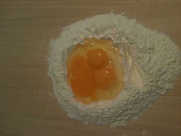 al final el aspecto final debe parecerse a la imagen (si nunca has probado a hacer pasta antes te sugiero seguir un tutorial como este: http://www.annies-eats.com/2011/01/10/homemade-pasta-tutorial-part-1-the-basics/)