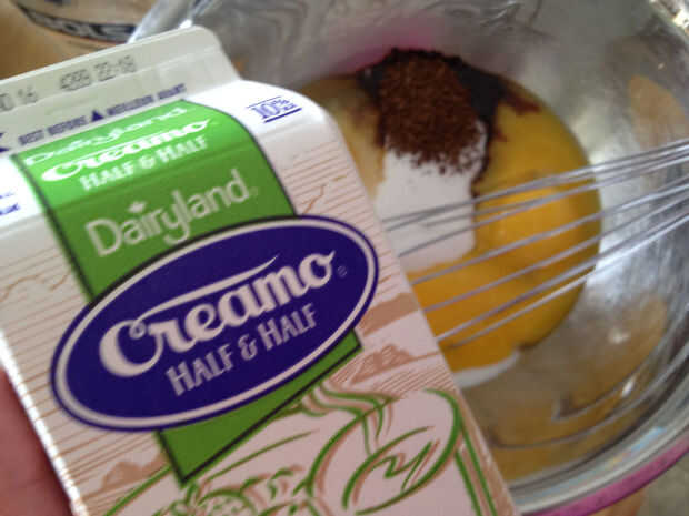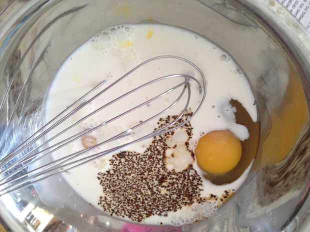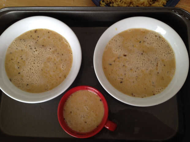 Coloque todos los ingredientes en un tazón, mezclar con batidor de alambre hasta combinar bien, después vierte en tazones