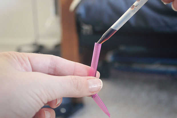 Utilice el gotero para llenar la paja con mezcla de vinagre. Nota: utilicé una mezcla de vinagre balsámico a la mitad, mitad sidra para mis gusanos para que sea más transparente y... ¿agusanado? Les apoyo en la nevera por un par de minutos para gel. Cuando está gelificados mediante, cortar el extremo sellado de la paja y exprimir su wormies hacia fuera.