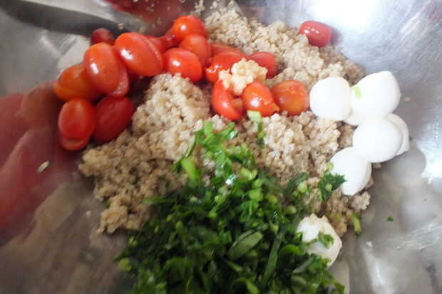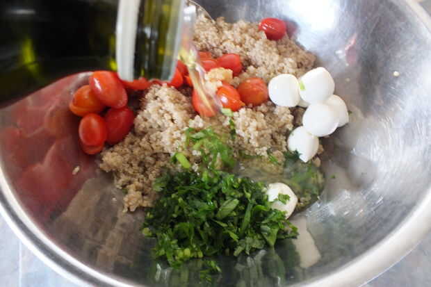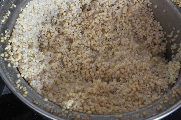 Hervir 1 taza de quinoa enjuagada en 2 tazas de agua con sal hasta que estén al dente (para la picadura).