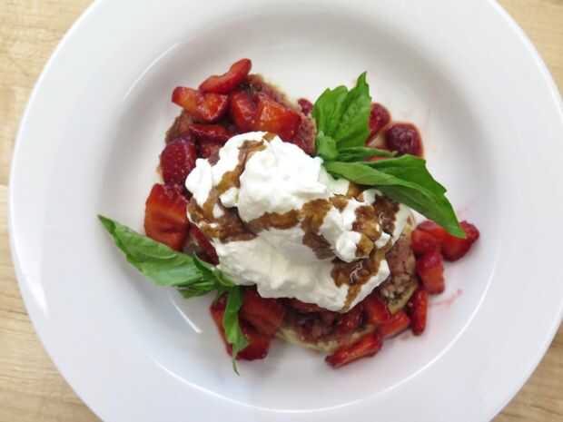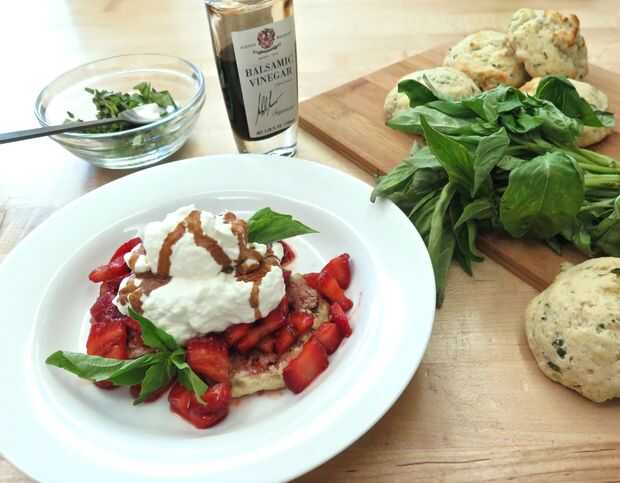 Fresas y vinagre balsámico es una combinación clásica deliciosa, así que aproveché que como mi salto de punto para el concepto de esta boca riego mash-up, añadiendo una dulce edad balsámico a mi mezcla de fresas. Mi mamá siempre hace su tarta de fresa con galleta escamada, no un bizcocho, para mi plato y creó un aceite ligeramente dulce, albahaca y ricotta gota galleta que es increíblemente fácil de hacer y tan deliciosas. Por último incorporé queso burrata cremosa rica en la crema batida para completar el perfil de sabor caprese.