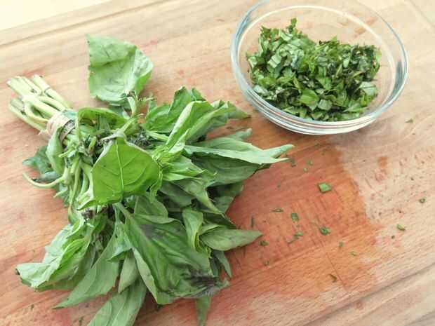 Antes de poner a su tabla de cortar, lavar y picar aproximadamente sobre 1/4 taza hojas de albahaca con un cuchillo grande.