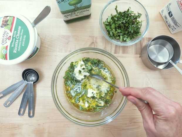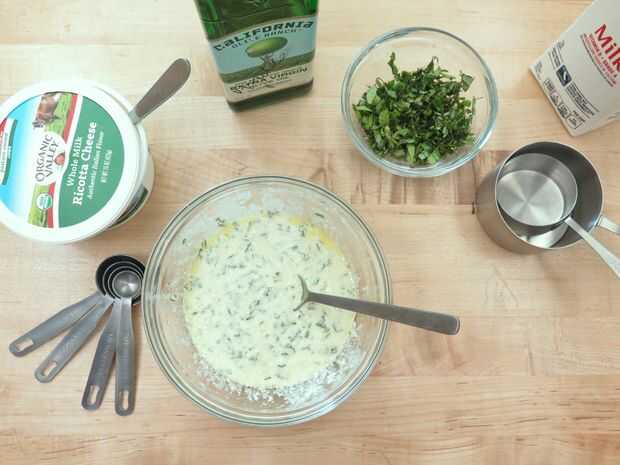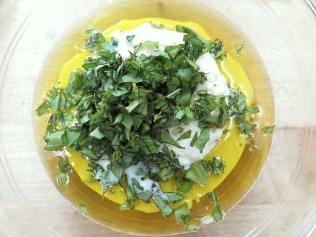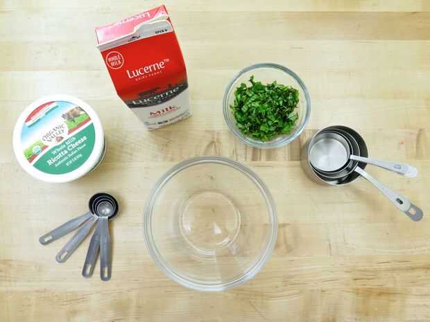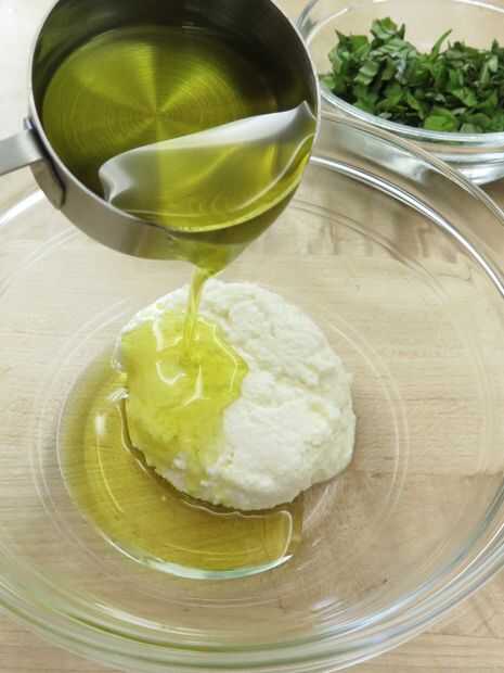 Combinar 1/2 taza de ricotta, 1/4 taza aceite de oliva y 1/4 taza de leche y 1/4 taza de albahaca en un recipiente de medio.