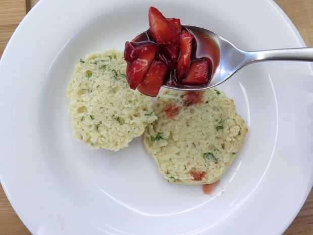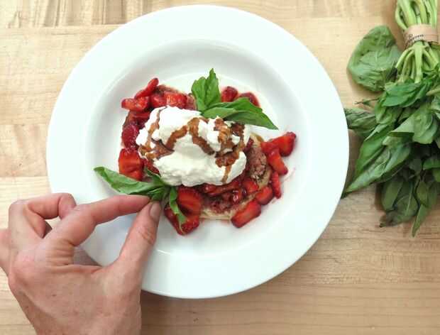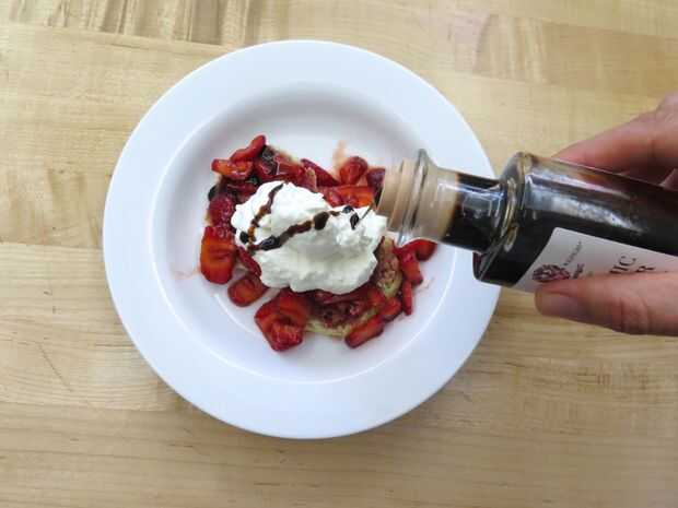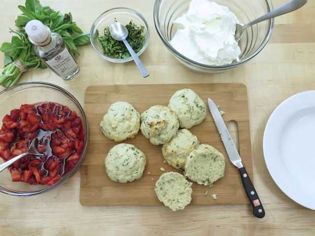 Mientras que sus galletas son todavía calientes, cortar por la mitad y disponerlas en placas. Les de la capa de fresas primeros y luego crema. Salpicar un poco de vinagre sobre la parte superior y decorar con hojas de albahaca.