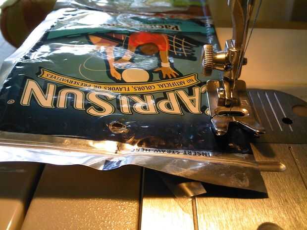 usé una máquina de coser con hilo de nylon pesado para coser juntos los paquetes de jugo Capri Sun! La parte más difícil fue limpiarlos antes de su uso. Yo les enjuagar en una mezcla de agua y lejía, asegurándose de que el enjuague tiene dentro del p