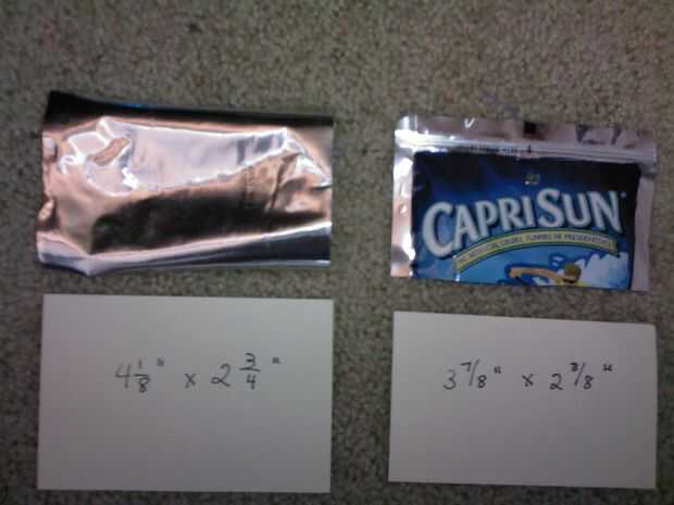 Uso de las dos titulares de tarjetas plantillas de 4-1/8 "x 2-3/4" y 3-7/8 "x 2-3/8". Trace la plantilla más grande en una "vuelta" de plata y cortar la pieza.  Trace la plantilla más pequeña en un Capri Sun "defrente" y cortar la pieza.
