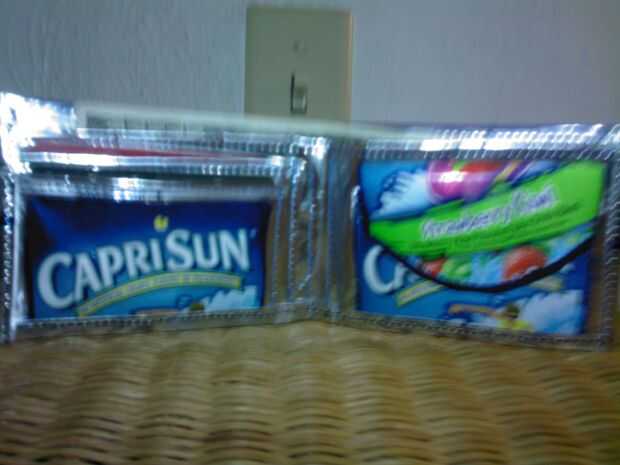 Termine su cartera - felicitaciones y yay!  Hay muchas variaciones que puede realizar en el diseño: por ejemplo tarjeta de más no bolsillos, titular de la moneda, matrimonio para un talonario de cheques, tri-fold o velcro una aleta en el extremo, etc..  Las únicas limitaciones son el número de contenedores de Capri Sun, que usted puede conseguir.  Pregúntales a tus amigos a guardar para usted.  Usted estará haciendo un gran proyecto, divertirse y reciclar, también!