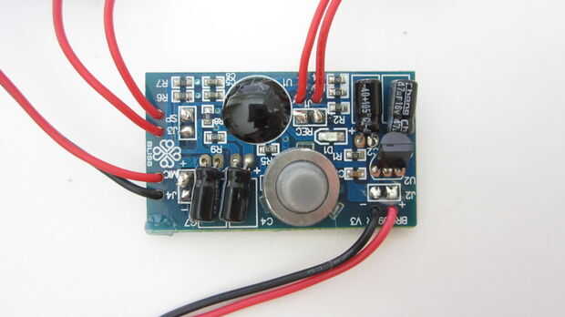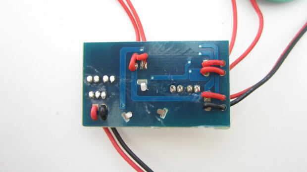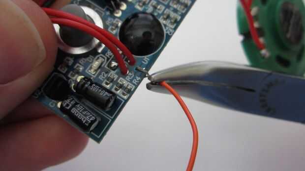 Tome un segundo pedazo de cable y el aislamiento de los extremos de la tira. Luego conecte un extremo del cable al lado del interruptor que está conectado al chip sobre el módulo de sonido (no el lado que está conectado el polo negativo).