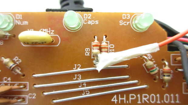 Activar la función de bloqueo de mayúsculas para que el LED está encendido. Luego tomar el extremo libre del cable que está conectado al interruptor de juego y toque a los terminales del LED y el resistor. Al menos uno de los terminales activará la función de reproducción en el módulo de sonido. En mi teclado, tocar el cable a cada terminal de la resistencia activa la función de reproducción.