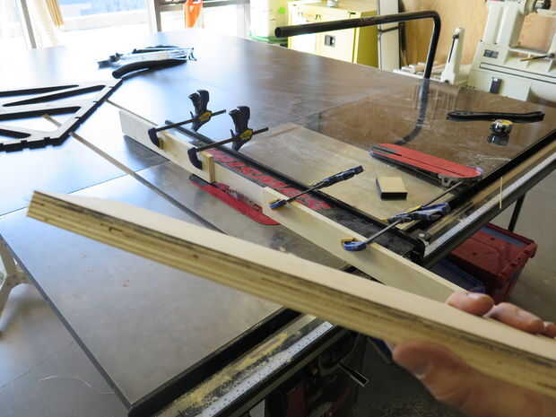Puesto que la pieza que estoy cortando no es cuadrada, sujeta unas tiras de madera contrachapada a la valla para que pudiera usarla como guía sin perder cualquier material de la pieza de madera que estoy inglete.