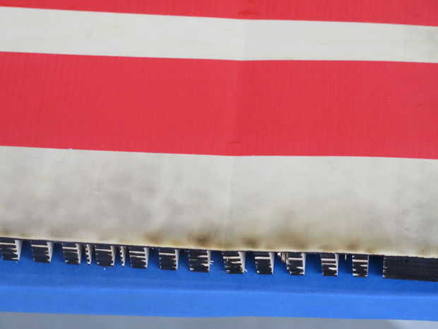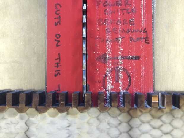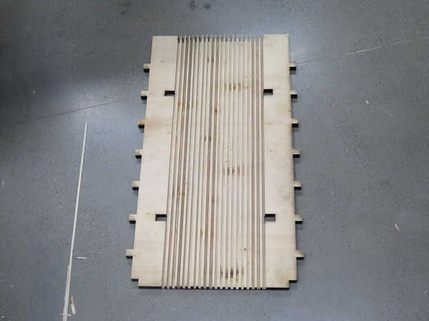 La forma más rápida de alcanzar las esquinas redondeadas de la cubierta parece corte de flexión. Para facilitar esto en mí mismo, he añadido un sistema largo de 1/2" de muescas en el borde de la pieza en archivo laser-esto me dio una guía para que coincida con la tabla de la hoja de sierra.